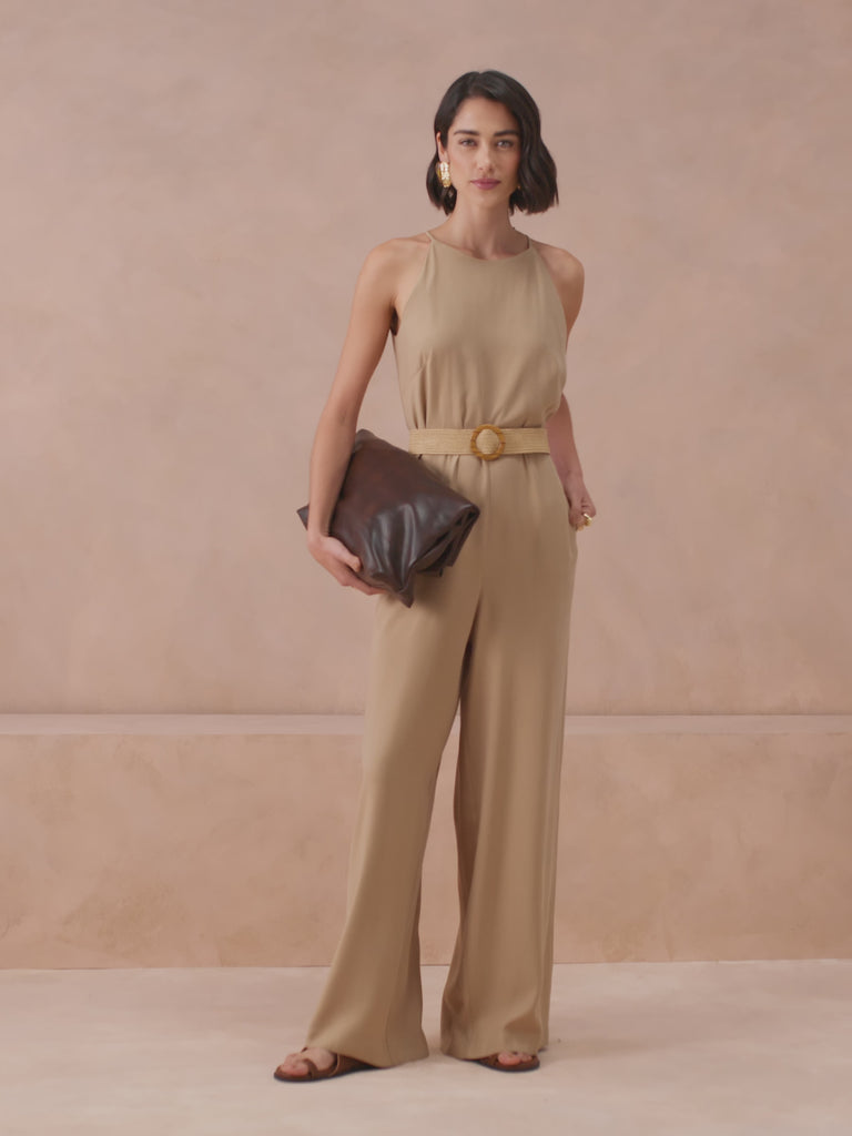 Long wide-leg jumpsuit cut from viscose suiting with a smooth, fluid drape. Designed with a round neckline, sleeveless bodice, straight torso, and front pockets. The belt defines the waist, while the full-length palazzo leg creates an elongated line. Unlined for light, comfortable wear from day to evening.
