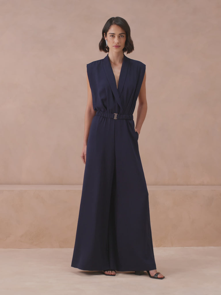 A wide-leg jumpsuit in lightweight suiting with minimal stretch. The crossover V-neck bodice and a self belt with a polished buckle define the waist, while the long, fluid leg creates an elongating line. Finished with short cap sleeves and front pockets. Unlined for an easy, comfortable drape.